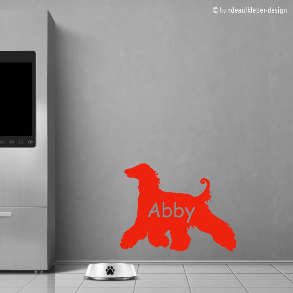 Afghanischer Windhund Hunde Wandtattoo mit eurem Wunschtext. Verschönert euren Wohnraum oder dekoriert den Fressplatz eures Hundes damit. Euren Wunschtext tippt ihr bitte in das Eingabfeld unter der Farbauswahl. Wenn ihr keinen Text eingebt wird euch nur der Hund geliefert.