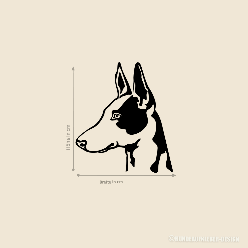 Podenco Autoaufkleber, wetter-, waschanlagenfest und UV-beständig. Wenn ihr möchtet könnt ihr einen Wunschtext, wie zum Beispiel den Namen des Hundes, mit angeben. Diesen schreiben wir dann in der abgebildeten Schriftart mit unter den Hundekopf. Wenn Ihr keinen Namen angebt wird euch nur der Hundekopf geliefert.
